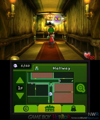 There are also “Portrait Ghosts,” ghosts that previously resided in Professor E. Gadd’s paintings but have managed to escape. These ghosts are different from other ghosts as they’re stronger and sport more unique designs and small puzzles that the player must solve so that way they can defeat them. An example of this is a portrait ghost themed after a butler which wanders through the halls with a candle. The player must light the candle on fire, frightening the butler to run into another room so he can douse the flame. Once the flame is doused, the player is able to suck him up. Another example is the very first portrait ghost players will encounter, Neville. Neville will taunt the player at first for not being able to suck him up as he’ll turn invisible anytime the player flashes their flashlight on him. The player will need turn their flashlight off or face the opposite direction until he yawns. Once he yawns, the player can quickly flash their light at him and suck him up. Boos will also appear later in the game and there’s a total of 50 of them to find and capture. They’re hidden throughout the mansion so the player will have to find them, which adds another fun little side activity to do in order to familiarize yourself with the mansion better. The ways the Boos are captured are also mechanically different than other ghosts, as the player needs to play a game of Hide and Seek throughout the mansion to find them. Upon finding them, all the player has to do is suck them up. If the Boo escapes the player’s vacuum, then it will leave to another room, which will force the player to give chase to them. Luckily, the Game Boy Horror is equipped to help find these Boos. The Game Boy Horror will start beeping whenever a spherical object is present, though sometimes Boos can leave decoys such as balls or even bombs, so players will have to be careful when searching for them. There are also boss ghosts which are featured at the end of each stage and are just slightly more cinematic portrait ghosts.