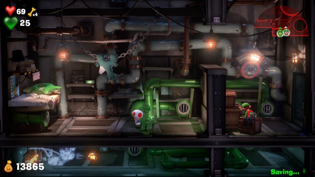 This game goes back to the original formula the first Luigi’s Mansion game had, ditching the mission-based system from 2 and making the world interconnected. Players will explore each floor of the hotel to find the missing elevator buttons which are held by various ghosts that the player will need to defeat most of the time. There are seventeen floors in total, with each floor having a different theme of some kind. For example, one floor is themed after a pirate ship while another is themed after a disco dance floor. Like the original Luigi’s Mansion, the game’s world is largely interconnected but is restricted at the start, though it becomes more and more open the more the player progresses through the game. A big new addition to the series though is the introduction of Gooigi. Gooigi originally appeared in the 3Ds remake of Luigi’s Mansion as the character the second player plays as while playing co-op. Gooigi invincible when it comes to spikes and can squeeze through narrow gaps like vents and grills. Unfortunately, water and fire will melt Gooigi if he comes into contact with either of the two in addition to having significantly less health than Luigi (Luigi has 100 hearts while Gooigi only has 30.) Gooigi is mostly used to solve puzzles and explore areas Luigi can’t normally access. With the addition of Gooigi though, the entire game can be played with two players working together.